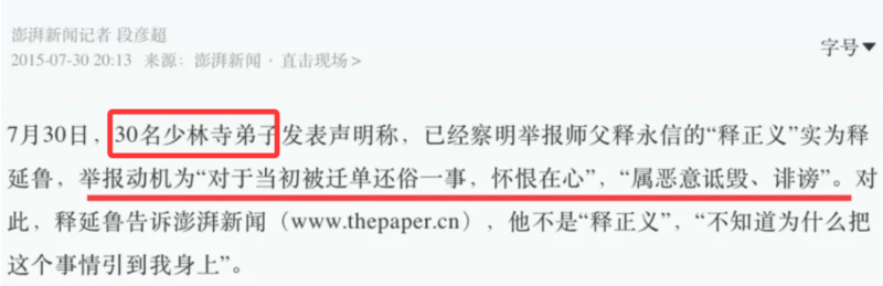 而且当时还有30名少林弟子站出来,表示举报释永信的僧人其实是对释永信怀恨在心,是恶意诋毁、诽谤: