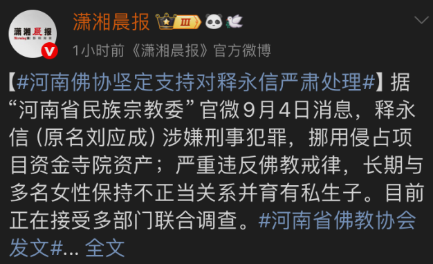 就在刚刚,河南佛教协会发布了一篇长文,文章表示,释永信涉嫌刑事犯罪、侵占公款、与多名女性有不正当关系并育有私生子,这种行为性质恶劣、影响极坏,因此坚决支持依法处理释永信……