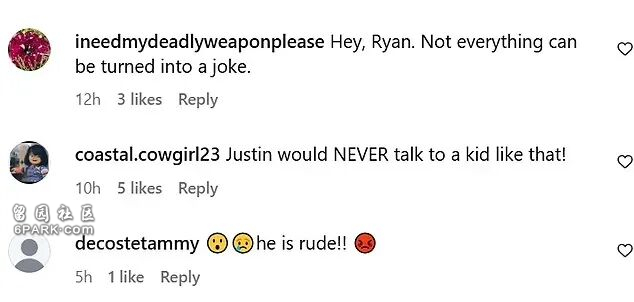 “贾斯汀(正和瑞安老婆布莱克打性骚扰官司的演员)绝不会那样跟一个孩子说话!”