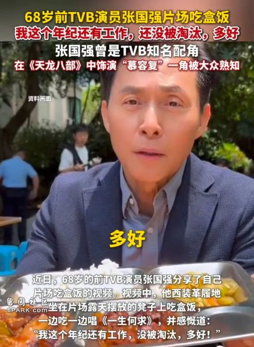 张国强在某书上晒自己片场吃盒饭,一边吃一边唱《一生何求》,然后说自己这个岁数还能有工开真好……