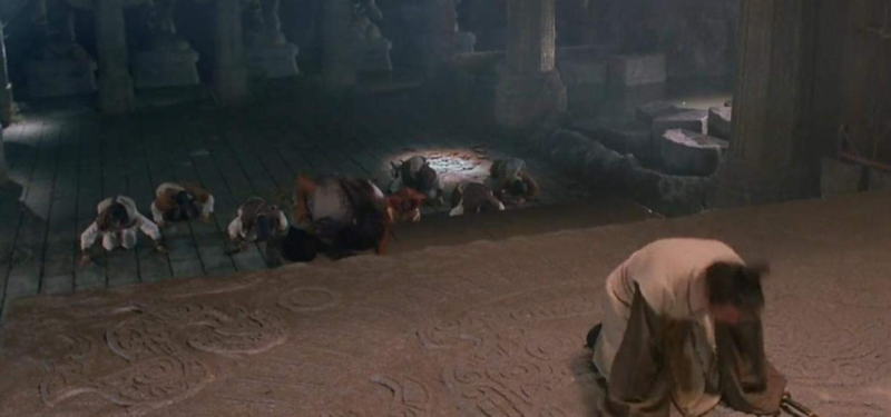 有些镜头实在无法规避,洪金宝干脆调暗灯光,让角色快速掠过镜头。
