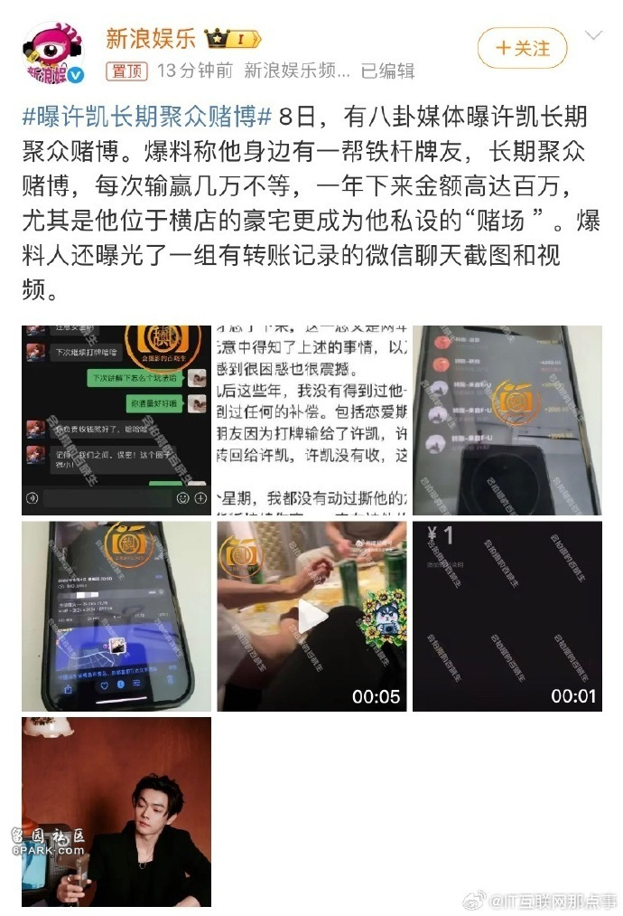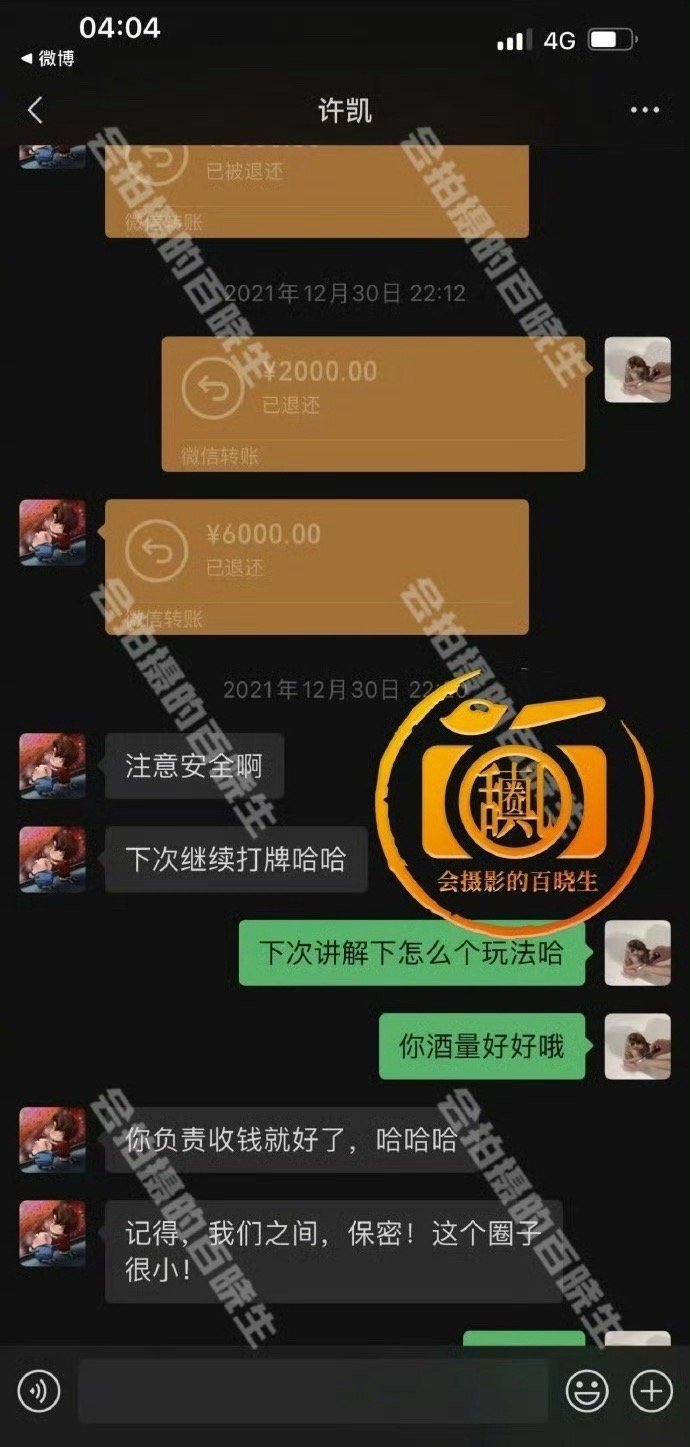 爆料直指许凯身边聚集了一帮固定牌友,长期在其位于横店的豪宅中组织牌局,单次输赢数额动辄数万元。更引人注目的是,爆料人还甩出了带有转账记录的微信聊天截图和视频,让“吃瓜群众”直呼“信息量巨大”。