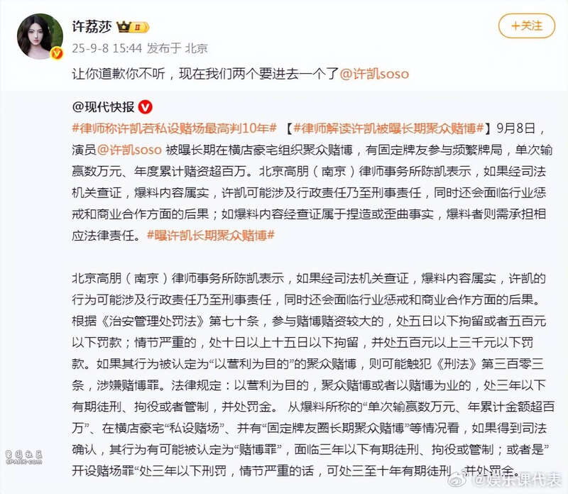 随后,前女友许荔莎转发律师解读,感叹:“让你道歉你不听,现在我们两个要进去一个了。”