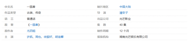 古装片《一瓯春》许凯、周也等主演,出品方光芒影业。