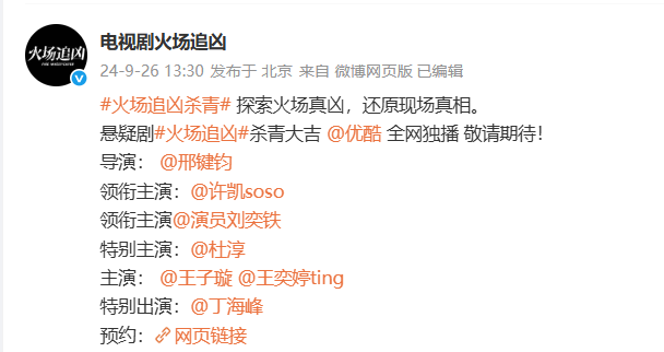 犯罪嫌疑片《火场追凶》,许凯、刘奕君主演,优酷出品。
