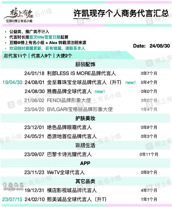 作为艺人,许凯也代言过不少产品,目前影响较大还在合作的有5个。