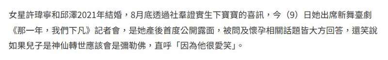 许玮甯和邱泽在2021年结婚,因为是闪婚,一直不被看好,两人上个月宣布第一胎儿子出生,而其实许玮甯早就产下儿子两三个月了。她还表示邱泽变了,以前比较务实,有了儿子后,梦幻的那点出来了,想帮儿子创造一个梦幻的世界,不管说是卡通还是什么,他希望不破灭,让儿子相信世界是美好的。