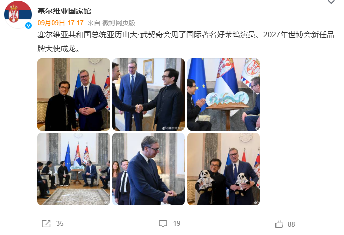 9月9日,塞尔维亚总统武契奇于在贝尔格莱德会见著名演员成龙,并委任成龙为2027年世博会品牌大使。
