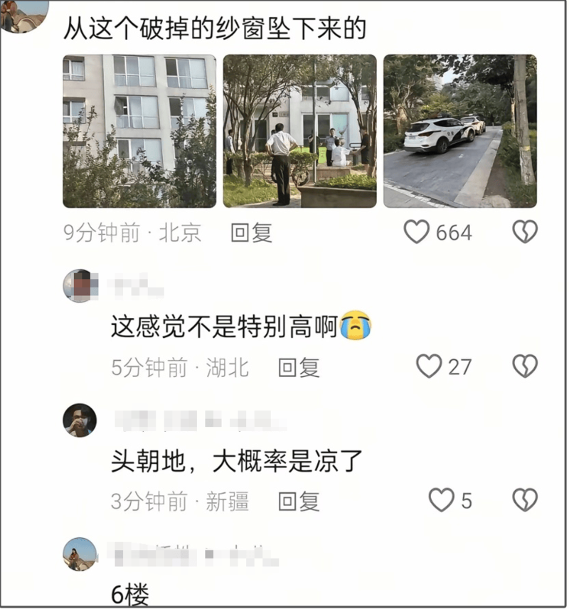 随后,有IP北京的网友晒出多张现场照称是于朦胧跳楼事发地。从照片来看坠楼楼层不高,该网友称是6楼,如若坠楼姿势是头坠地那么存活率不高。
