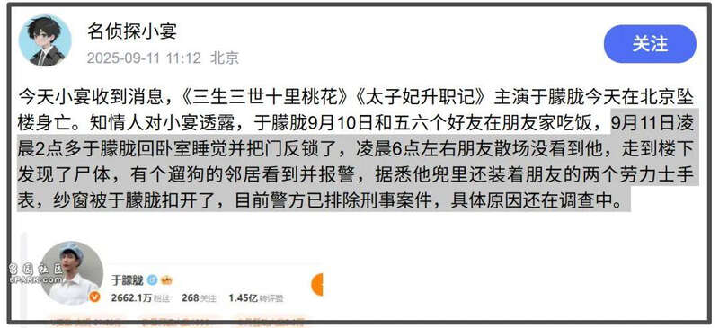 9月11日,突然有多位网友爆料称于朦胧跳楼身亡,随后狗仔称某出演过《三生三世十里桃花》且粉丝数超过2000万的男演员在北京坠楼死亡,引发热议。