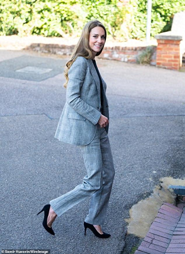 凯特当天所穿的灰色调的西装,让她显得很是飒爽,同时也是有一定深意的,因为所采用的面料是经典的“威尔士亲王格纹”。
