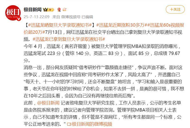 迅猛龙的考研之路始终伴随争议。录取消息曝光时,不少网友质疑其“靠颜值走捷径”“借考研立人设”。但她直接硬核回应:“用考研炒作太笨了,风险太高了。”