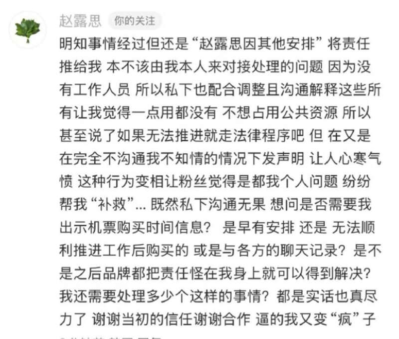 对于品牌单方面的说法,赵露思心寒直言:「既然私下沟通无果,想问是否需要我出示机票购买时间信息?是早有安排还是无法顺利推进工作后购买的,或是与各方的聊天记录?是不是之后品牌都把责任怪在我身上就可以得到解决?我还需要处理多少个这样的事情?都是实话也真尽力了,谢谢当初的信任谢谢合作,逼的我又变『疯』子」。