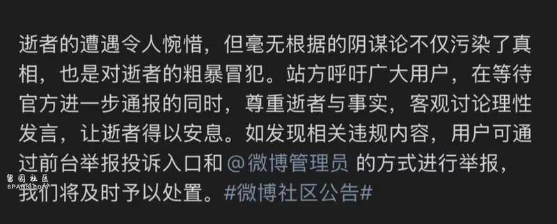 逝者的遭遇令人惋惜,但毫无根据的阴谋论不仅污染了真相,也是对逝者的粗暴冒犯。站方呼吁广大用户,在等待官方进一步通报的同时,尊重逝者与事实,客观讨论理性发言,让逝者得以安息。如发现相关违规内容,用户可通过前台举报投诉入口和@微博管理员 的方式进行举报,我们将及时予以处置。