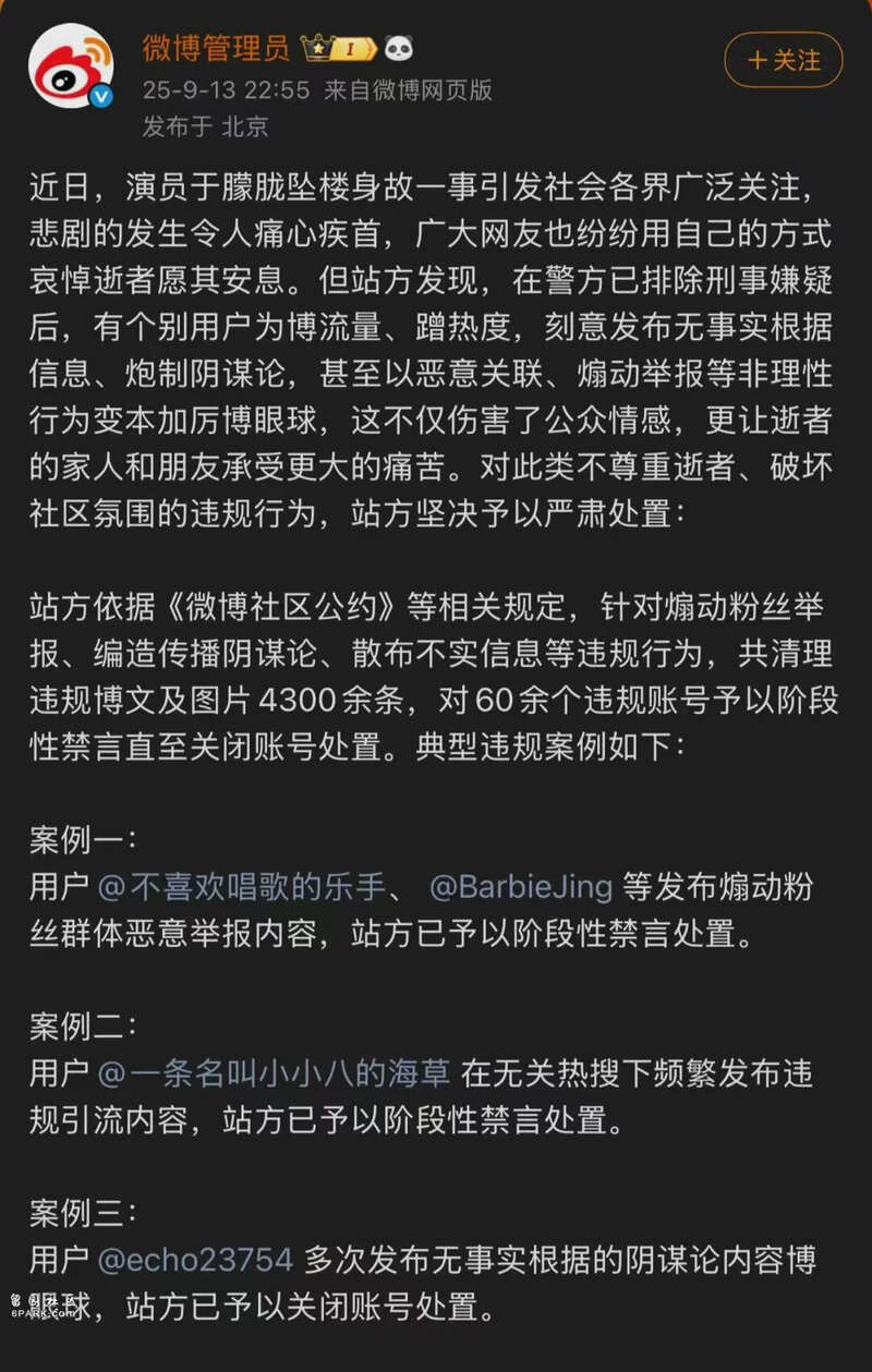 今日(9月13日)22时许,@微博管理员 通报关于演员于朦胧坠楼身故一事后,多账号违规行为。