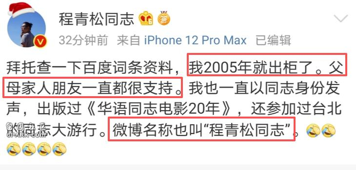 当时的程青松已经是行业大咖,再加之早已自曝过“出柜”的事,所以有恃无恐。