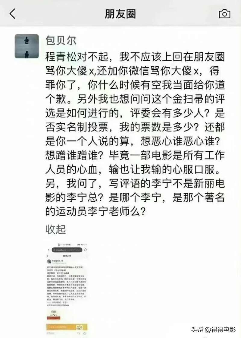 包贝尔就曾经在朋友圈对程青松破口大骂,质疑金扫帚奖的专业性和评奖制度,认为程青松就是碰瓷,想蹭谁就蹭谁。