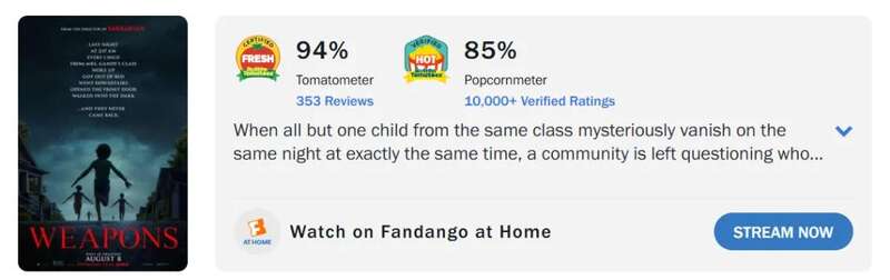 比如最近刚上线的新片《凶器》,8月份刚上映时就口碑大爆,烂番茄新鲜度94%、爆米花指数85%。