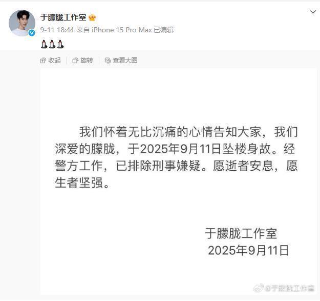 9月11日18时44分,于朦胧工作室官方微博发文称,于朦胧于2025年9月11日坠楼身故,经警方工作,已排除刑事嫌疑。