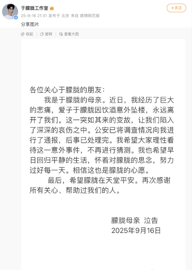 我是于朦胧的母亲。近日,我经历了巨大的悲痛,爱子于朦胧因饮酒意外坠楼,永远离开了我们。这一突如其来的变故,让我们陷入了深深的哀伤之中。公安已将调查情况向我进行了通报,后事已处理完。我希望大家理性看待这一意外事件,不再进行猜测。我也希望早日回归平静的生活,怀着对朦胧的思念,努力过好每一天。相信这也是朦胧的心愿。