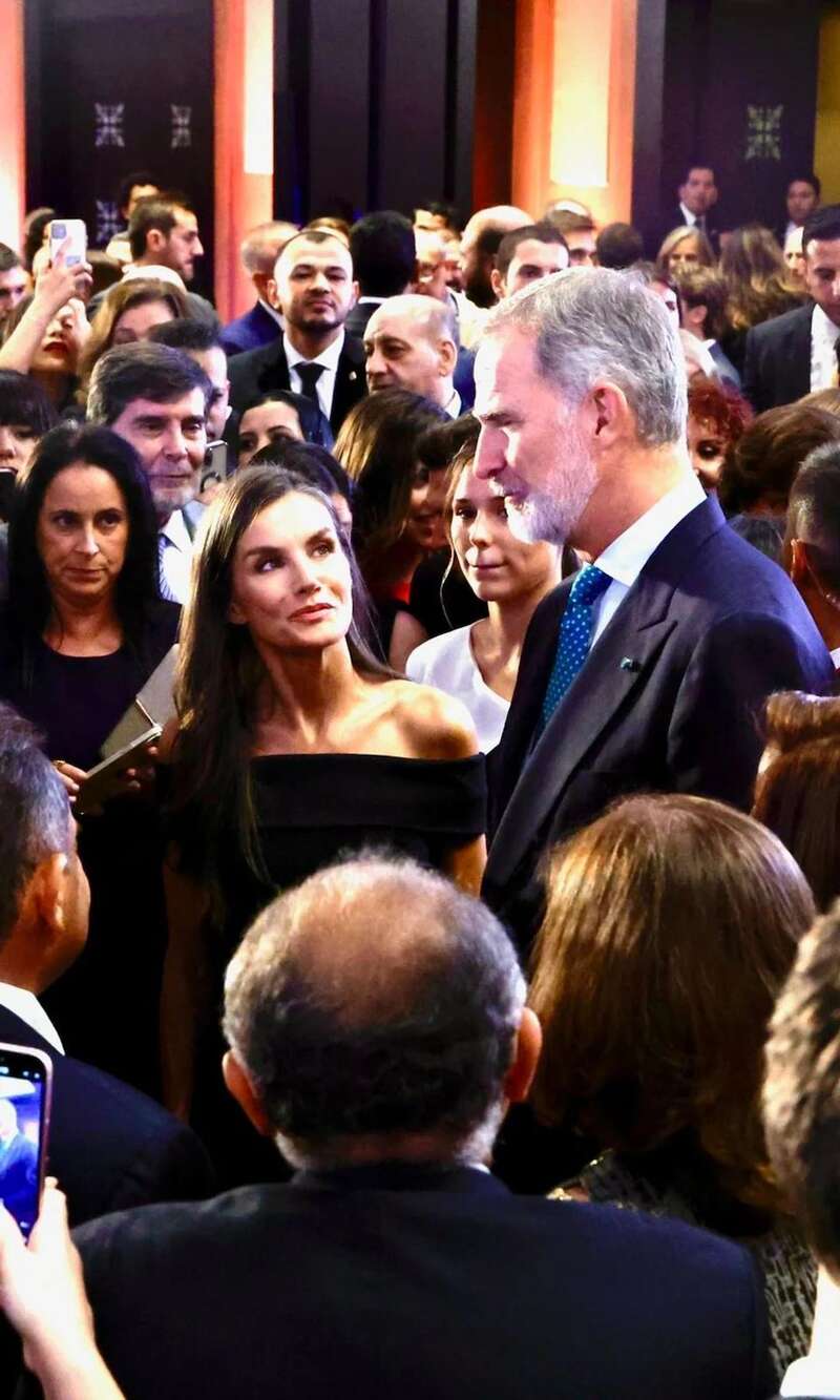 当费利佩国王和在埃及的西班牙同胞们聊天时,莱蒂齐亚在不经意间用深情的目光注视着丈夫,尽显老夫老妻之间的恩爱与默契。