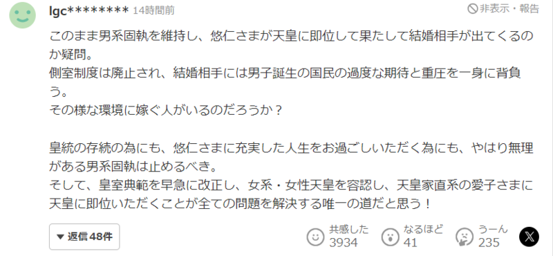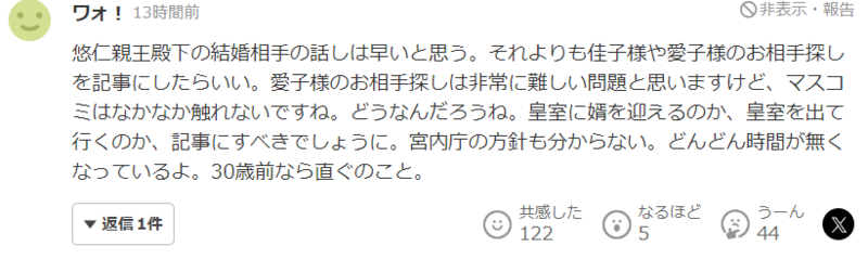 觉得现在就讨论悠仁亲王的结婚对象还为时过早。比起这个,媒体更应该去报道佳子公主和爱子内亲王的婚事问题。尤其是爱子的婚恋问题,我认为是非常棘手的难题,但媒体却一直避而不谈,这究竟是怎么回事呢?将来是该让女婿进入皇室,还是让公主们脱离皇籍出嫁?这些话题本应被公开讨论。