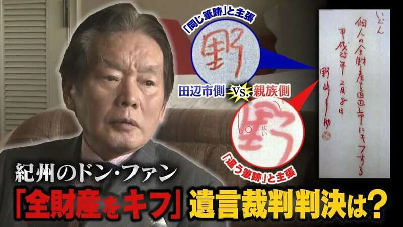 对于亲属方面的主张,遗嘱执行律师及田边市反驳称:“野崎生前就习惯使用红色书写,遗嘱并非潦草之作,而是认真书写,具备有效遗嘱的形式。”同时指出,遗嘱上的签名与野崎此前在催款通知等文件上的签名笔迹特征一致。