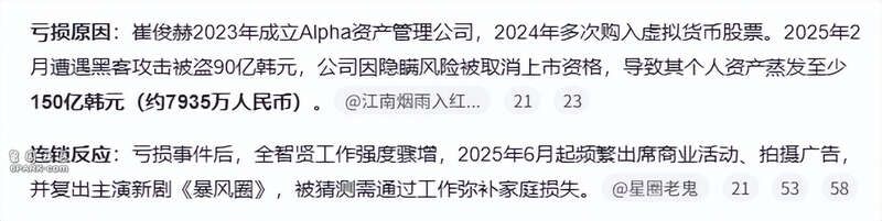 据韩媒报道,崔俊赫名下的公司此前被黑客入侵盗走90亿韩币,后续因为隐瞒风险被取消上市资格,到今年6月,个人资产共计蒸发了150亿韩币。