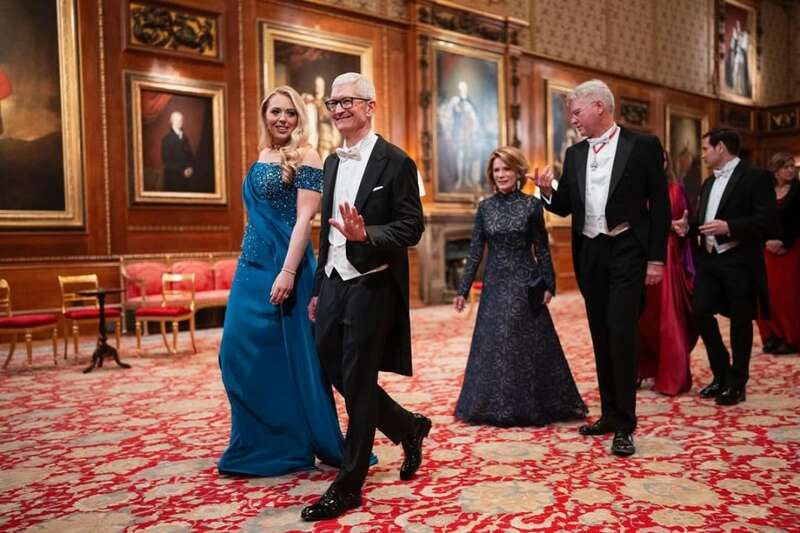 当晚身着宝蓝色晚礼裙的蒂芙尼,被安排走在苹果公司CEO蒂姆·库克的身边,两个人都洋溢着灿烂的笑容。