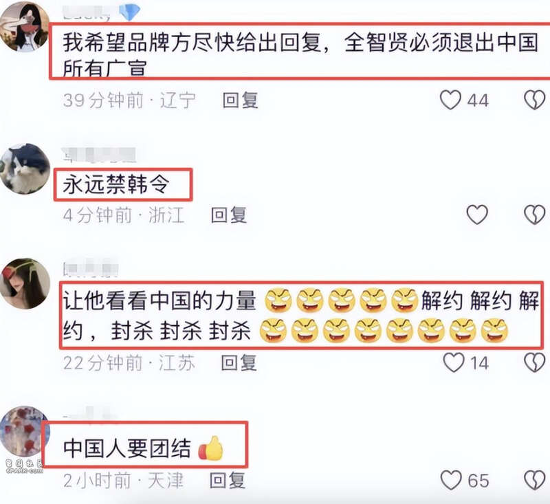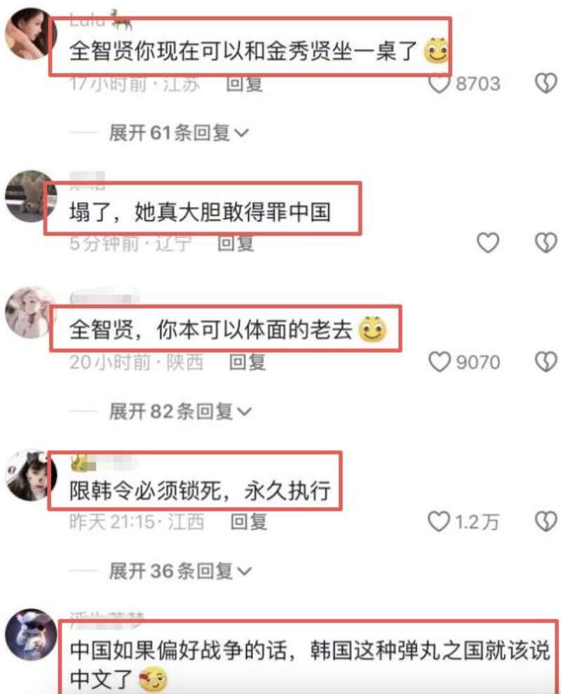 网友们都呼吁彻底封杀全智贤,并且要求限韩令必须焊死,不允许这群上不了台面的韩国人,再来中国捞金。