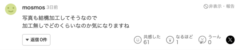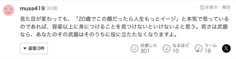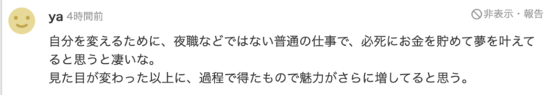 “为了改变自己,她没有去夜场,而是全靠自己拼命攒钱实现梦想,真是太厉害了!相比外观的变化,我认为她在追求梦想的过程中获得的品质,让她更添魅力。”