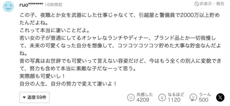 “这个孩子,不是靠去夜场或者出卖肉体,而是靠做搬家工人和保安而攒到2000万日元,这真是太了不起了。年轻女孩一般都会希望各种漂亮饭、奢侈品之类的,然而她竟然可以完全压抑这种物欲,全心全意想着未来变得可爱的自己,坚持不懈地默默打工赚钱。