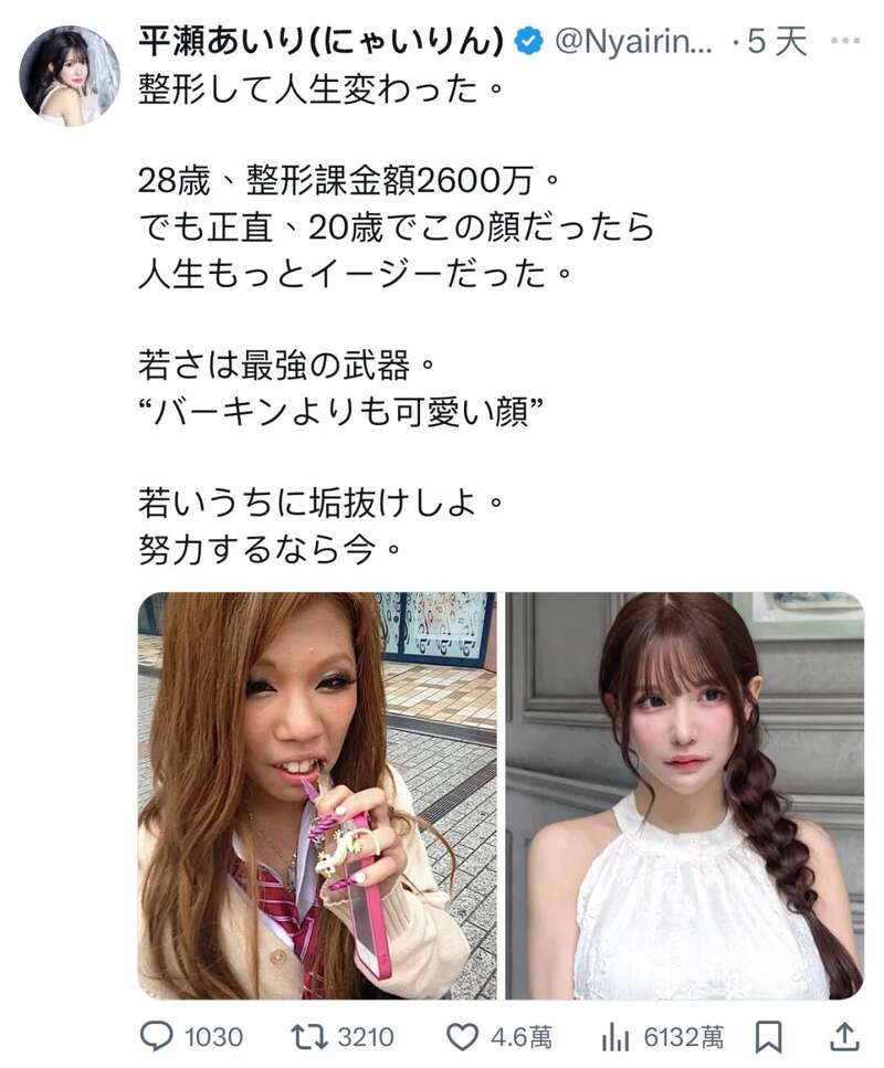 28岁日本模特平濑爱里最近凭借整容,频频刷屏日本热搜。她声称前后共斥资2600万日元(约合人民币126万元)改头换面,毫不忌讳地分享自己整前整后的对比照片,并后悔自己没有早点整容: