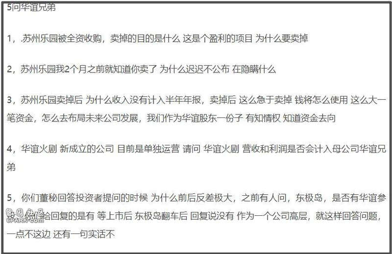 目前已经有网友以股民身份向华谊提出质问,针对韩资全资收购影视城提出三点疑问——第一问盈利的项目为什么卖;第二问为什么隐瞒消息偷偷卖;第三问卖掉的收入为什么不计入半年年报。