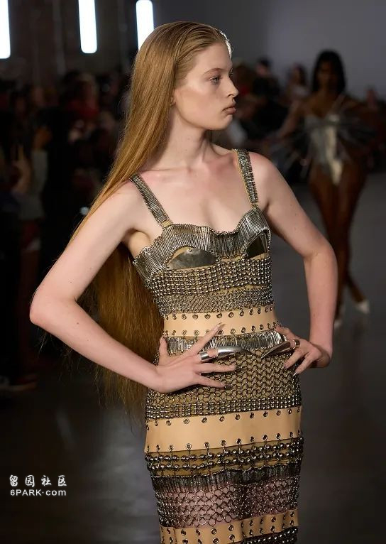 亚裔设计师哈巴纳的发布会延续了她此前参与的几场秀的风格——不只是时尚表演,更是社会议题的延伸。18 套雕塑感造型在“束缚与解放”的主题下展开,未来感与 BDSM 元素交织,由多位跨性别模特共同演绎。