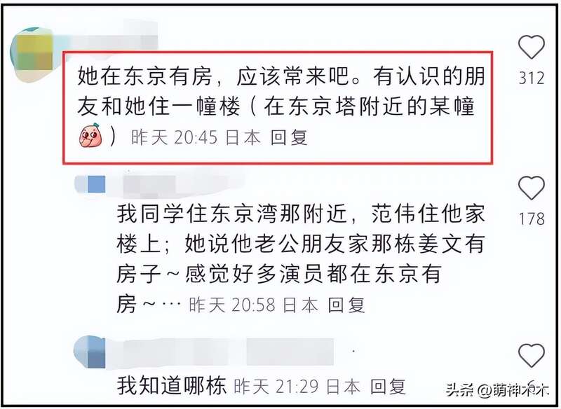 针对这一点,评论区有ID在日本的网友爆料,其实范冰冰早就在当地买房了,身边有朋友和她住在同一幢楼,还曝出了大概的位置,随后继续有网友爆料,许多明星都在那边有房子。