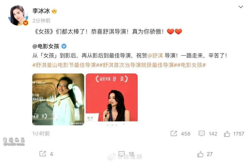 李冰冰说:《女孩》们都太棒了!恭喜舒淇导演!真为你骄傲!