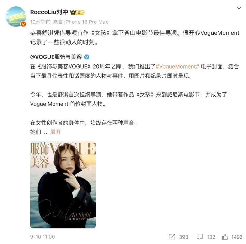 《服饰与美容Vogue》编辑总监刘冲说:恭喜舒淇凭借导演首作《女孩》拿下釜山电影节最佳导演。很开心VogueMoment记录了一些很动人的时刻。