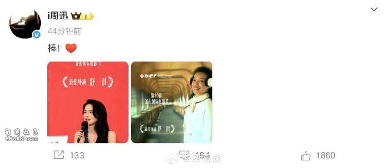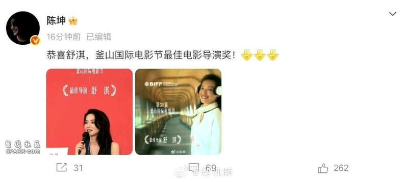 陈坤说:恭喜舒淇,釜山国际电影节最佳电影导演奖!