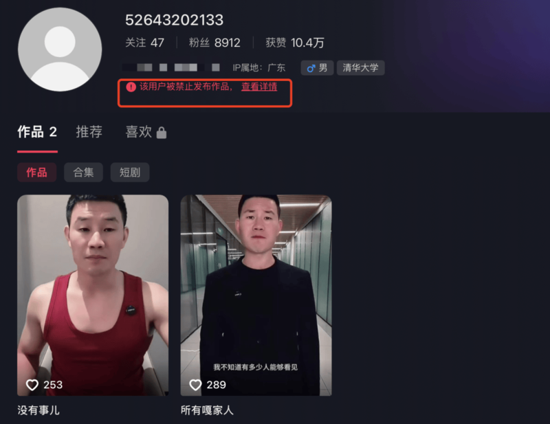 果不其然,在网友的努力之下,嘎子小号被禁言,目前就剩下了两条作品,按照这个节奏,嘎子接下来的复出之路应该是相当艰难了。
