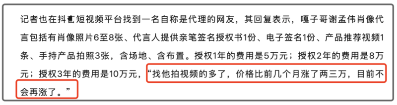 可工作人员的回答却令所有人都感到意外,对方表示就算嘎子是进去过的人了,现在依旧有很多人找他,因为他热度高流量大。包括嘎子肖像权代理合作方也表示,现在嘎子授权肖像权使用1年的费用是5万元,2年的费用8万元,3年的费用是10万元,这个价格比之前涨了两三万,但当下不会再涨价了。