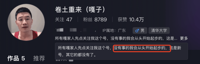 截至目前,没有商家品牌方晒出和嘎子最新的合作内容,毕竟账号都被封禁,不管是祝福视频还是带货视频,都没有渠道发出来。但在某短视频平台,疑似嘎子哥小号曝光,小号里的内容都是嘎子的忏悔,目前已经有八千多粉丝,简介中写到,嘎子会从头开始起步的,不知道是否还会重操旧业继续带货。