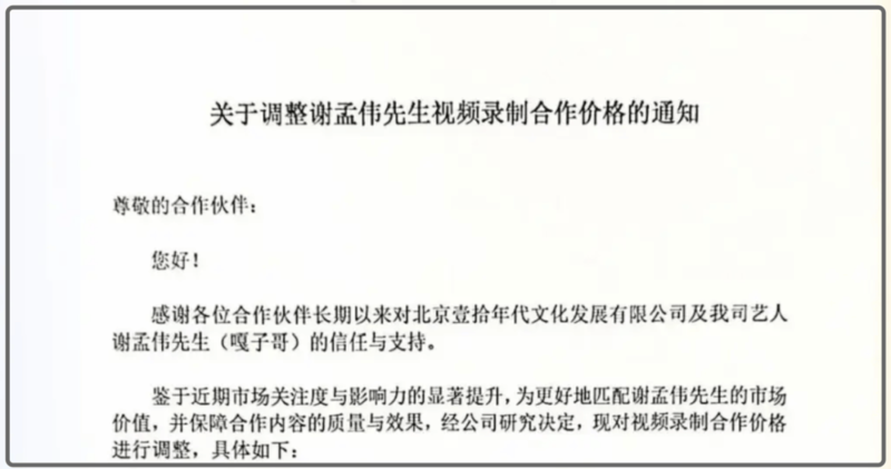 根据发通知的公司员工表示,公司有权限可以销售嘎子谢孟伟的祝福视频,现在一条祝福视频价格为2000元,但如果是产品推荐类视频(带货视频)则无法报价,需要经过各种检验验证后才能定价,从这一决定也能看出,嘎子团队对选品也是开始严格了。