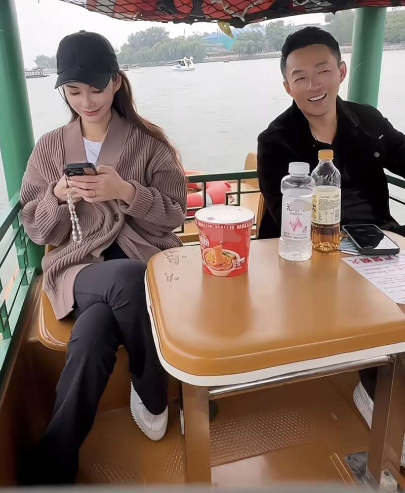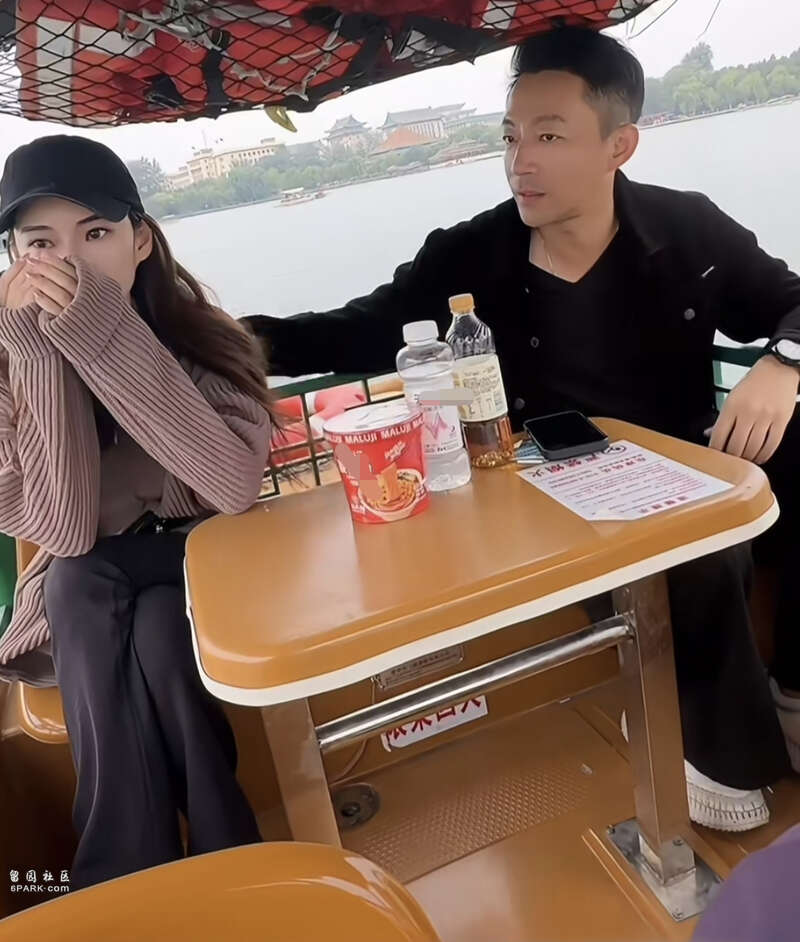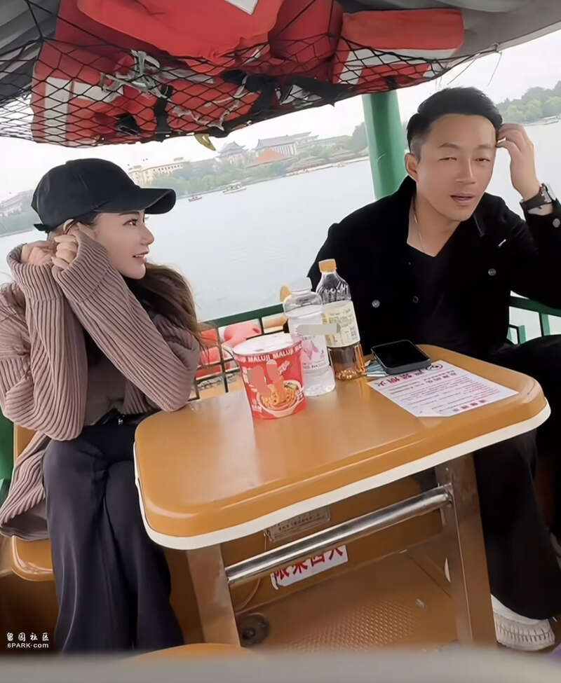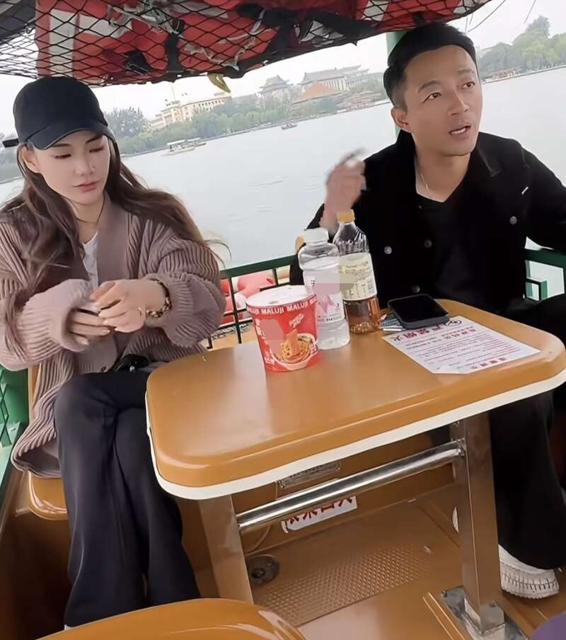 在散步结束之后,他们还坐船游湖观光,夫妻俩坐在一排,一边聊天一边欣赏风景,全程都很悠闲。