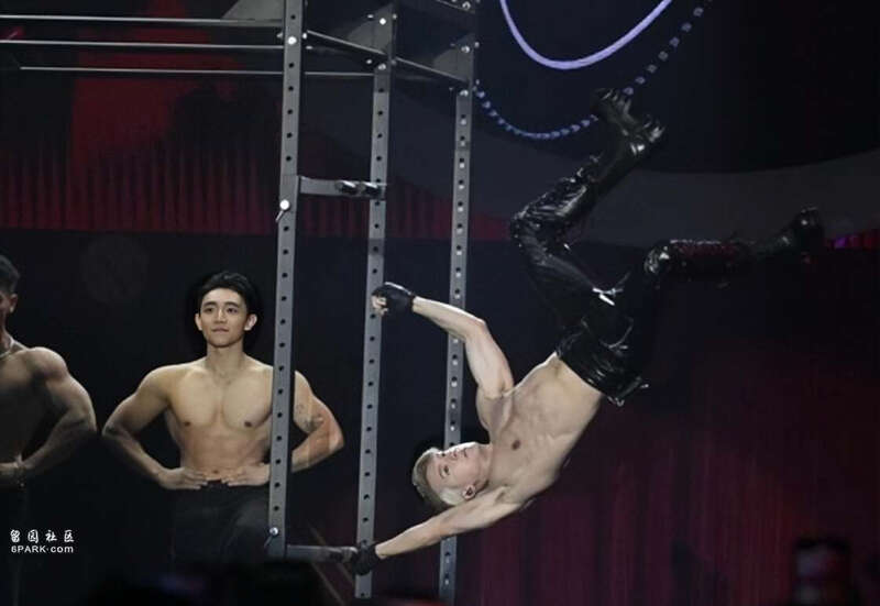 只见台上的关智斌一边秀腹肌,一边脱衣服,相当抢镜。为了舞台表演多样化,关智斌还大跳框架舞。