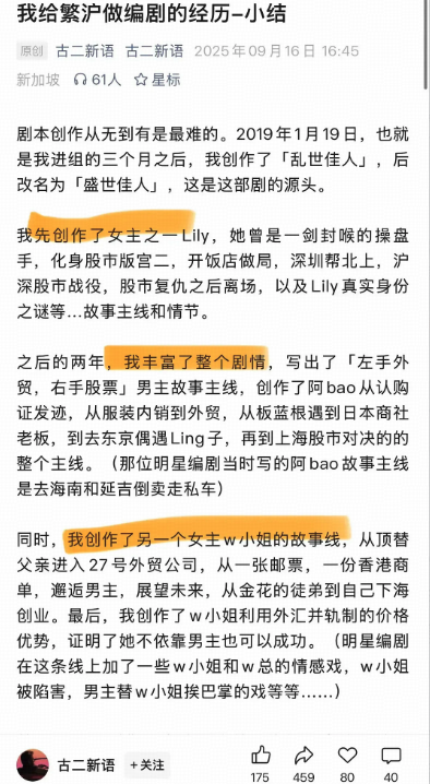 声明里提到的“程某某”,就是这次舆论的爆料人“古二”,自称是繁花最初的编剧。
