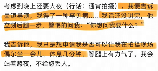 有一次,他表达出自己想休息的意图,导演不但没有体谅他、安抚他,反而紧张地问他“想要什么”,仿佛是担心他趁机讹人。