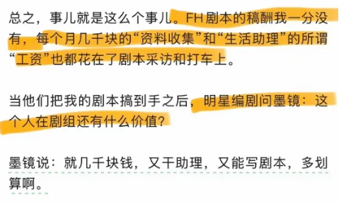 他还说,自己又写剧本又当助理,但一分钱稿酬都没有拿到,只有每月几千的工资。