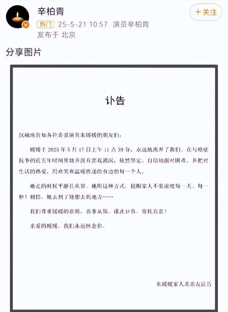 这一天上午10点57分,辛柏青发布了朱媛媛的讣告,从此消失于人前。