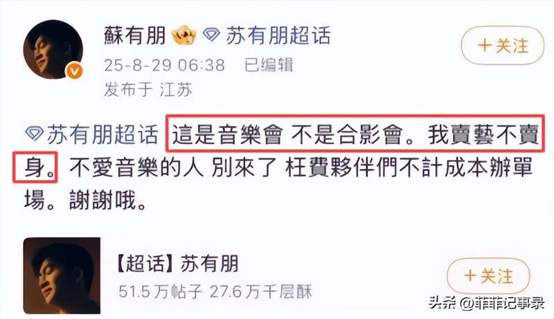 当粉丝提出普通票观众也应享有合影权益时,苏有朋回应”这是演唱会,不是合影会”,更直言”不爱音乐就别来”,这番言论立即引发众怒。